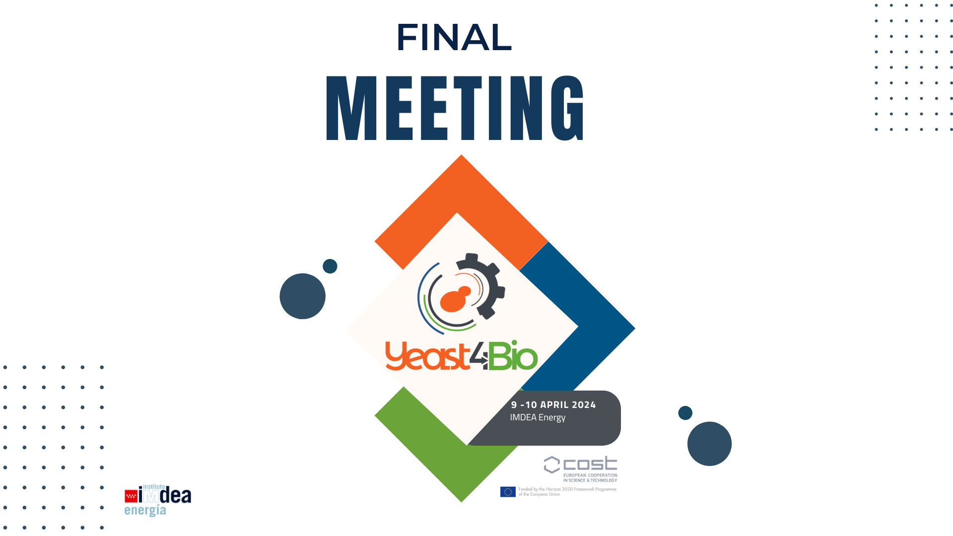 Final meeting Yeast4Bio The event is finished. Date Apr 09 - 10 2024 Expired! Time 09:00 - 18:00 More Info Program Location IMDEA Energía Category Event Events-Home Program Share this event
