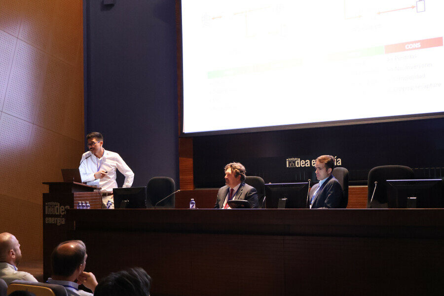 Posteriormente, Miguel Ochoa (Global technical director, Huawei Digital Power) ofreció una visión completa sobre la normativa de conexión a red, y Rafael Mallo (Senior storage engineer, Iberdrola) expuso resultados de operación de proyectos reales de almacenamiento energético. Marcos Calvo (R&D director, Isemaren) presentó las características avanzadas de los controladores de planta (PPC) para instalaciones hibridas, y finalmente Javier Roldán investigador titular de la Unidad de Sistemas Eléctricos de IMDEA Energía, abordó el papel de las tecnologías grid-forming en la evolución de los sistemas eléctricos.